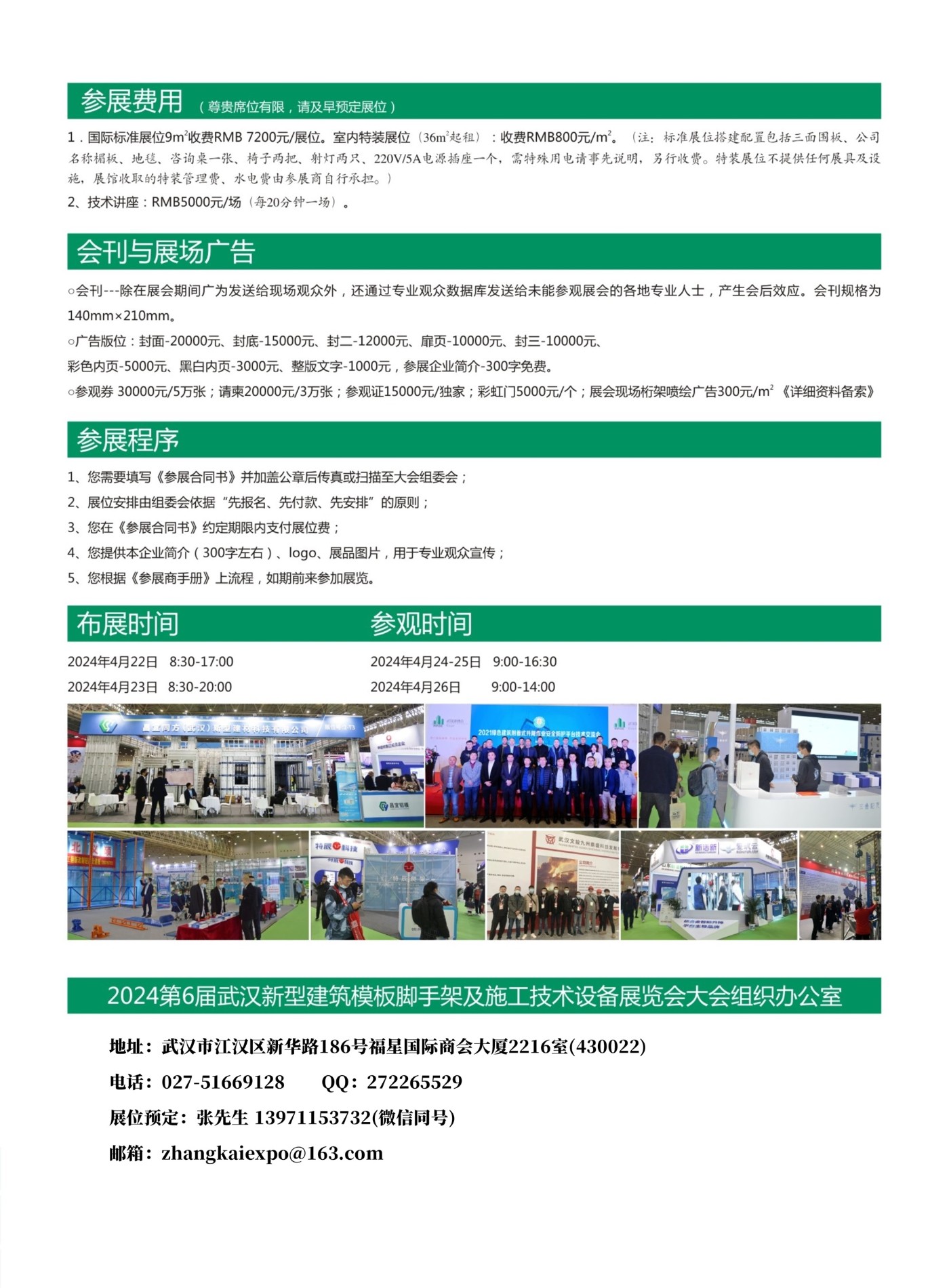 宣传推广。2024武汉模板脚手架展还将在中国建筑模板网、中国模板脚手架网、建筑模板网、中国钢模板网、中国木业网、中国脚手架交易网、中国建材租赁网、武汉建设信息网等专业网刊以及展会、协会自媒体,本地武汉晚报、楚天都市报等主流传媒上发布会讯或刊登广告,篇幅达一千余,全面扩大、提升本届展会影响力。