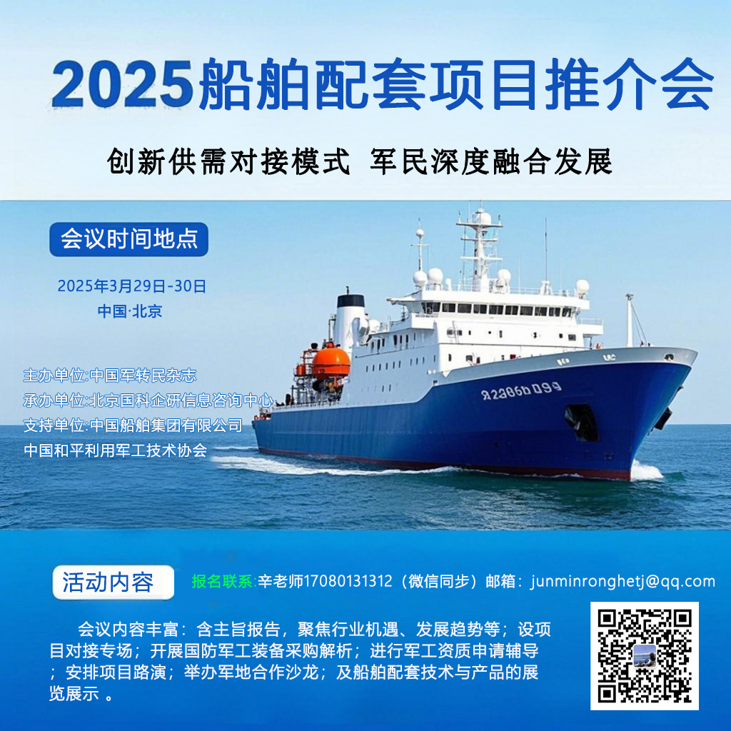 为提升我国船舶工业供应链安全保障能力,《中国军转民》杂志将于 2025 年3月29-30 日(28日报到)在北京举办 “2025 船舶配套项目推介会” 。会议主题为 “创新供需对接模式,军民深度融合发展”,内容涵盖主旨报告、项目对接、采购解析等。诚邀中船集团及下属企业、军队物资采购部门、船舶军工配套企业参会。