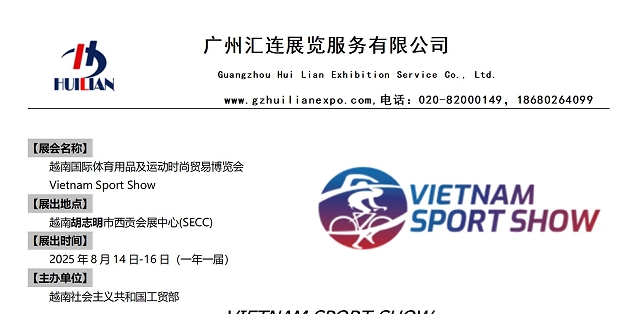 【展会名称】 2025年越南国际体育用品及运动时尚贸易博览会 Vietnam Sport Show 【展出地点】 越南胡志明市西贡会展中心(SECC) 【展出时间】 2025年8月14日-16日(一年一届) 【主办单位】 越南社会主义共和国工贸部