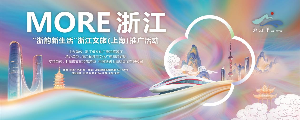 12月10-11日,由浙江省文化广电和旅游厅主办,浙江省各市文化广电和旅游局联合承办,上海市文化和旅游局、中国铁路上海局集团有限公司支持的 MORE浙江——“浙韵新生活”浙江文旅(上海)推广活动即将在上海外滩中央广场举行。活动将集结众多浙江知名IP走进上海,展现“烟柳画桥,风帘翠幕,参差十万人家”的别致风情与千年浙韵隽永深远的文化底蕴。高铁与文旅相遇,铺画江浙沪的诗与远方,值“沪苏湖高铁”开通在即,沪浙两地游客可以搭上“More浙江”号的快车,感受浙沪文旅互联的强劲脉动。