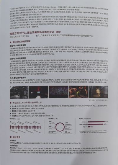 参展联系方式:1314 5977 656(李小姐) 2025广州设计周 时间:2025年12月5-8日 展馆:广州保利世贸博览馆 广州国际采购中心 南丰国际会展中心